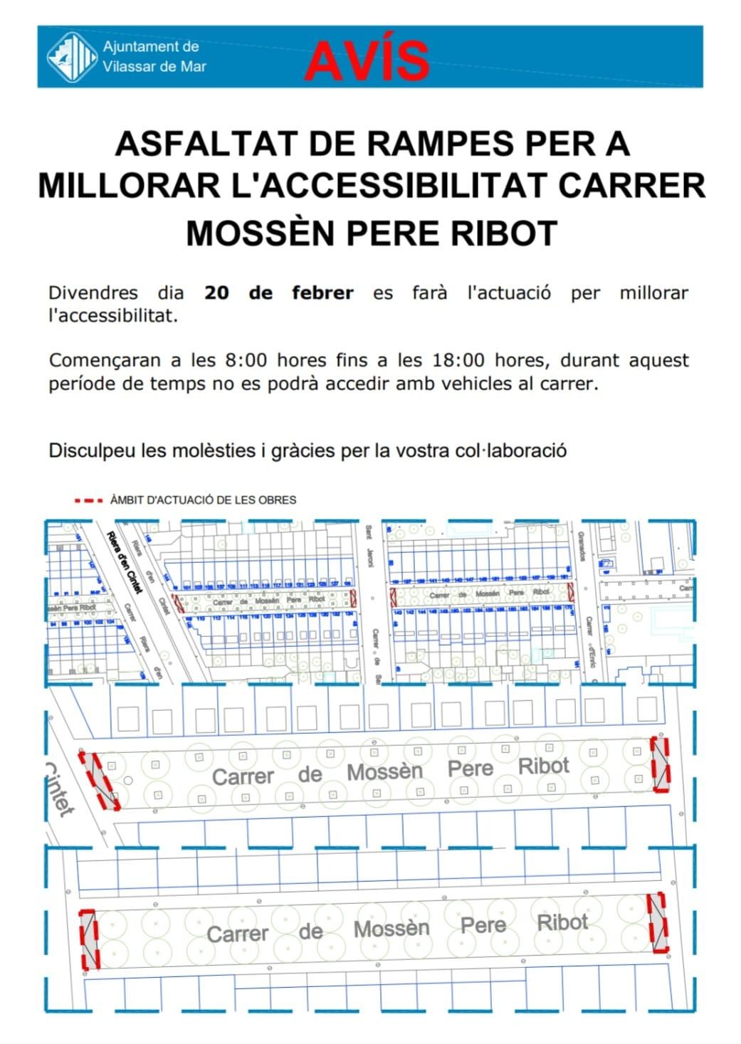 - Asfaltat de rampes per millorar l’accessibilitat al carrer Mn. Pere Ribot, concretament entre la Riera d’en Cintet i Sant Jeroni i entre Sant Jeroni i Enric Granados. L’horari previst de l’actuació és de 8 a 18 h.