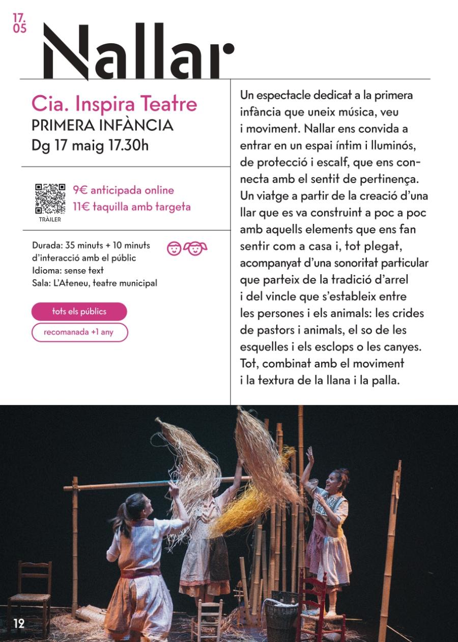 Nallar ens convida a entrar en un espai íntim i lluminós, de protecció i escalf, que ens connecta amb el sentit de pertinença. Un viatge a partir de la creació d’una llar que es va construint a poc a poc amb aquells elements que ens fan sentir com a casa i, tot plegat, acompanyat d’una sonoritat particular que parteix de la tradició d’arrel i del vincle que s’estableix entre les persones i els animals: les crides de pastors i animals, el so de les esquelles i els esclops o les canyes. Tot, combinat amb el moviment i la textura de la llana i la palla.