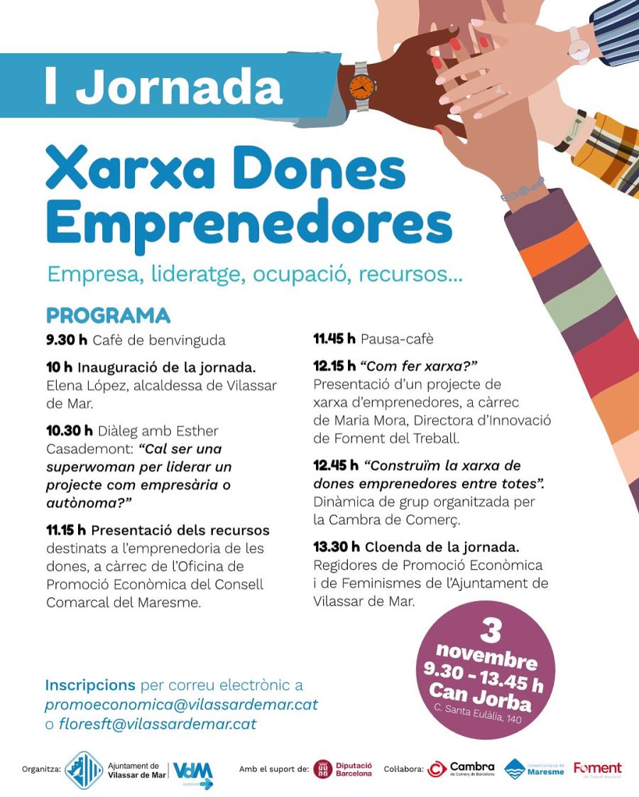 El proper dilluns 3 de novembre, Can Jorba acollirà la I Jornada Xarxa Dones Emprenedores, una trobada oberta a totes les dones emprenedores (autònomes, propietàries de comerç i d'empreses) de Vilassar de Mar, que servirà per intercanviar experiències, establir sinergies i informar sobre els recursos disponibles per a l'emprenedoria femenina.